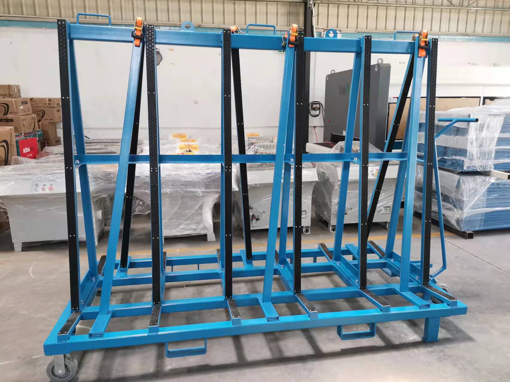 此設計用于廠區內外的板材運輸和儲存,支架表面覆蓋一層橡膠層,保護板材免于刮傷。